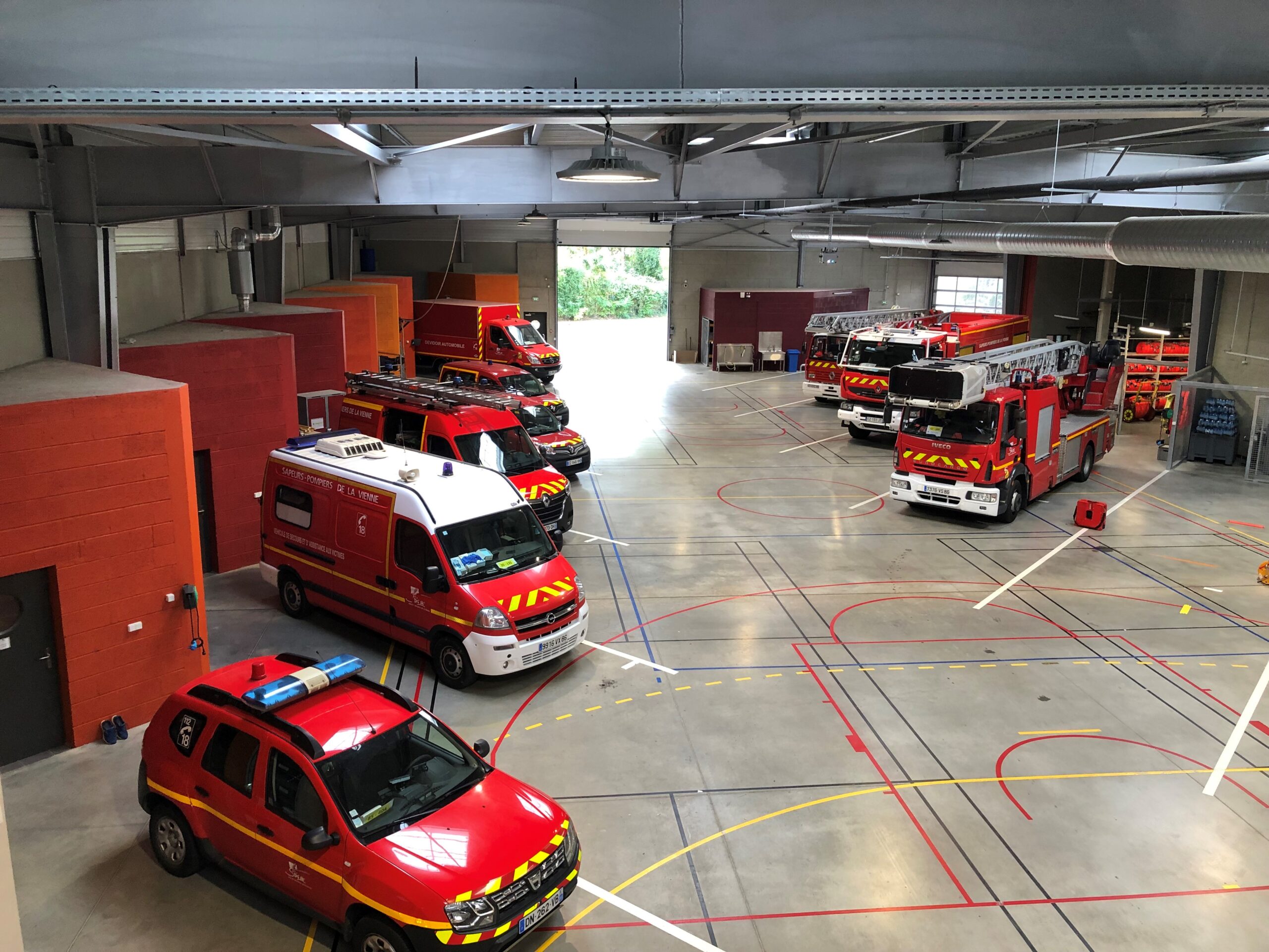 La remise, orientée Sud-Ouest / Nord-Est, assure des départs rapides en intervention et s’inscrit pleinement dans une logique de marche en avant. Les voies de circulation périphériques respectent les rayons de giration des engins et distinguent clairement l’aire de départ de l’aire de manœuvre et d’exercices.
