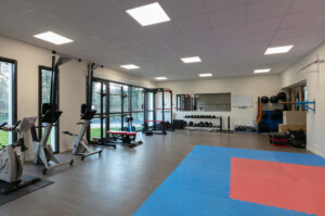 Les espaces de détente, de restauration et de musculation sont implantés au Sud, bénéficiant d’une orientation favorable et d’un isolement acoustique optimal. Le foyer se prolonge largement vers l’extérieur grâce à une casquette fixe et une pergola mécanique, doublant les capacités d’accueil et favorisant les usages collectifs.