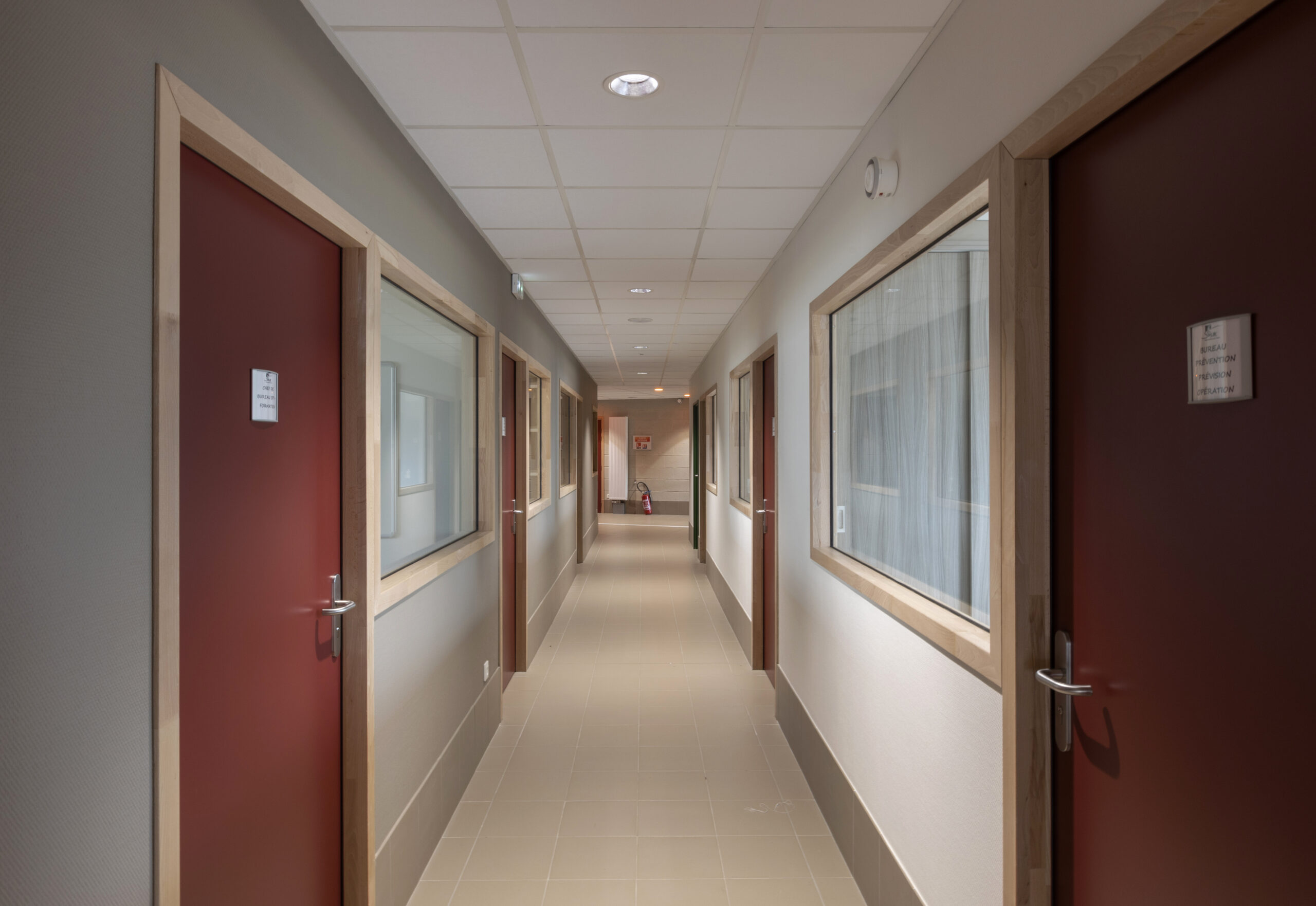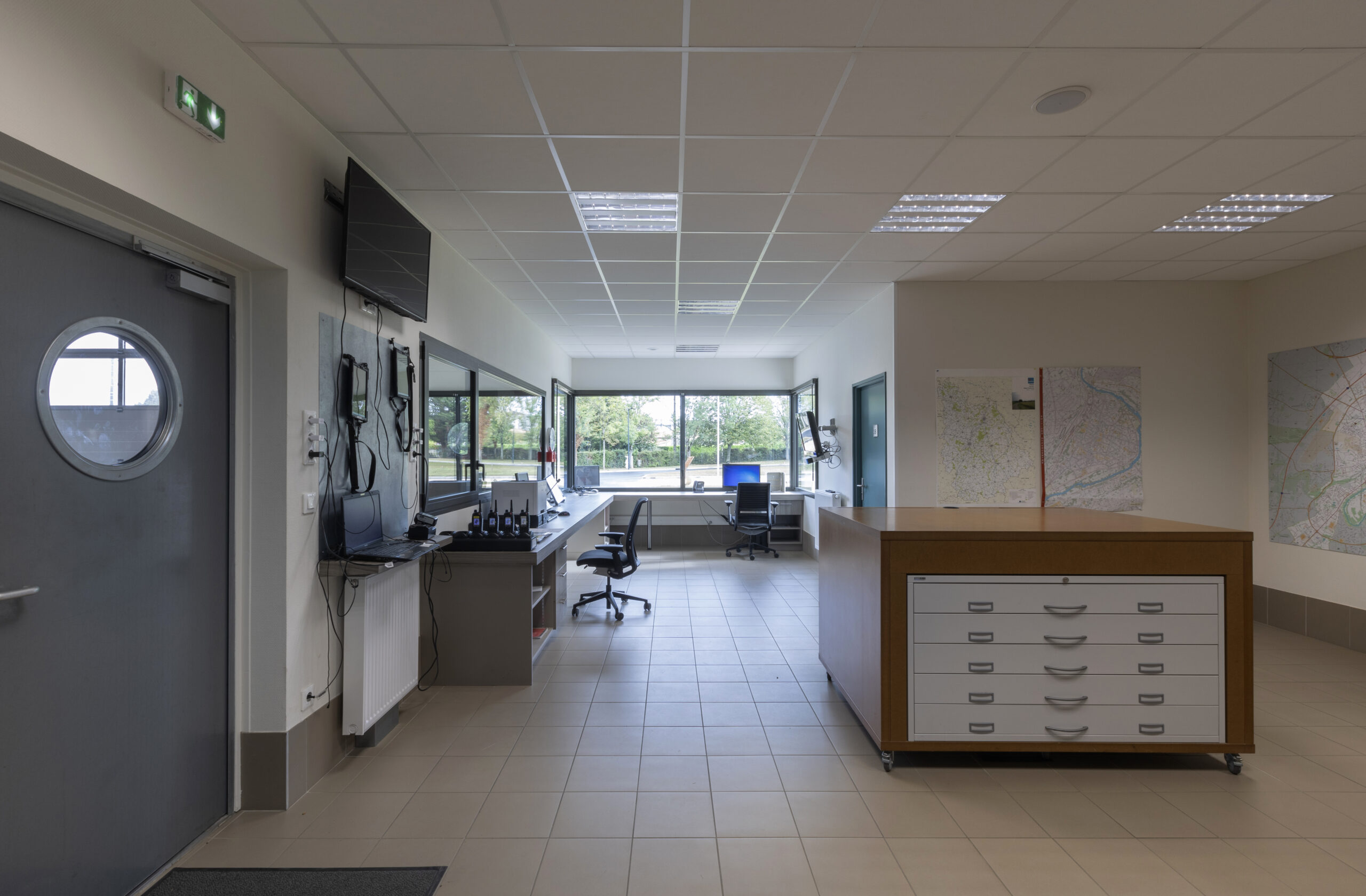 L’entité alerte et réunion est conçue à géométrie variable. Grâce à des parois mobiles, elle s’adapte aux usages quotidiens de formation comme aux situations de crise. Trois salles distinctes peuvent fonctionner indépendamment ou se réunir pour accueillir des conférences de plus de 80 personnes. Une réserve centrale facilite le rangement du mobilier et des équipements selon les configurations.
