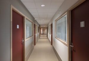 L’organisation intérieure repose sur une logique en peigne, lisible et hiérarchisée. À l’entrée, les locaux administratifs et de commandement s’implantent de manière linéaire. Un bureau situé à la croisée des flux permet une surveillance naturelle des circulations et peut devenir un poste central en situation de crise.